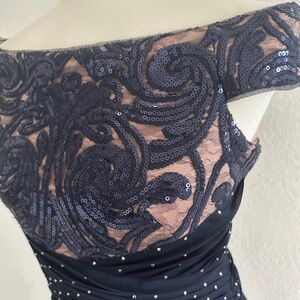 This is an elegant navy blue evening gown featuring an off-the-shoulder illusion neckline. The bodice is crafted with sheer nude mesh adorned with intricate navy sequin scroll embroidery, creating a striking contrast. The waist is cinched with ruched detailing embellished with small (owner added) sparkling rhinestones, adding a touch of glamour. The skirt flows into a column silhouette with gathered draping at the front and back, offering a flattering and elongating effect. Perfect for formal occasions, galas, or sophisticated evening events. Gently used.Fits like a size 6.