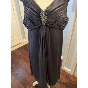 Adrianna Papell Occasions dress, women's size 16. Pleated front and back bodice and the off-the-shoulder neckline create a sleek and elegant look. Beautiful crystal and beaded floral detail at center chest. Drapes and flows from the empire waist. Deep silver-gray color. Measures 20" armpit to armpit, 37" length. Fully lined, zips at back.