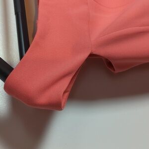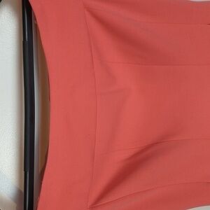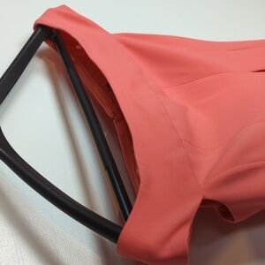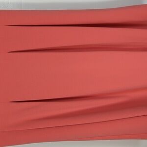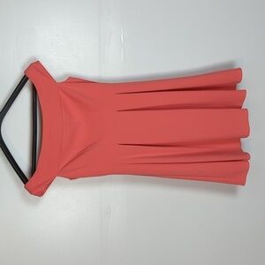 Salmon pink. Fit-and-flare silhouette. A-line, pleated skirt. Zip back. Hanger straps have been removed. Great for Valentine's Day, Easter, garden parties, and other spring or summer events. Excellent condition -- no stains, holes, or fraying. Laid flat pit-to-pit: 16in. Laid flat waist: 14.5in. Shoulder to hem: 33.5in.