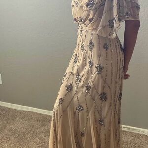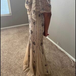 Elegant one shoulder dress by Adrianna Papell. Features cream fabric with gold embellishments. Perfect for formal occasions.