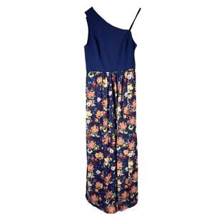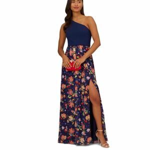 Adrianna Papell One Shoulder Floral A-Line One Shoulder Evening Maxi Dress Size US 16. New with tags, no flaws. Measurements are approximates only. Crepe Chiffon dress in navy multi.