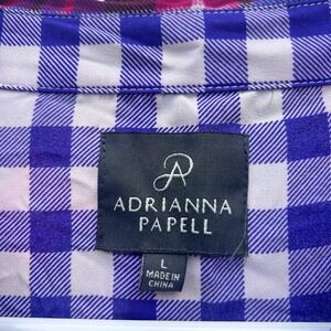 Elevated sophistication meets modern charm in this Adrianna Papell plaid shirt dress. A relaxed silhouette begins with a collared neckline and button-down front, to the waist line, flowing into a knee-length hemline. Designed with a blue and white checkered liner and a sheer plaid overlay in pink, purple, black, and white, it creates a layered, dimensional effect. The versatile roll-tab sleeves can be worn long with buttoned cuffs or rolled to 3/4 length, while an adjustable drawstring waist flatters your figure with a customized fit. Effortless to wear, this piece transitions seamlessly from workwear to weekend brunch or even a relaxed vacation getaway. Perfect for Fall Festival or Fall Outfit. Pair with flats or pumps for a timeless finish.