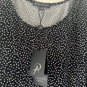 This elegant Adrianna Papell blouse features a flutter sleeve design and a stylish tie front, crafted in a beautiful dark navy and white hue. The cap sleeves and ruffled details add a touch of femininity, making it a perfect choice for both casual and dressy occasions. Its lightweight fabric ensures a comfortable and airy fit, ideal for warm weather.