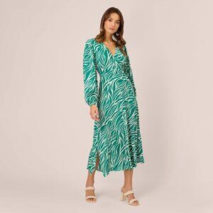 Adrianna Papell Printed Faux Wrap Dress With Bishop Long Sleeves In Green Ivory
