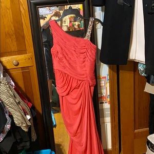 Beautiful coral prom dress worn once from Adrianna Papell. 2 shoulder strap dress, with one strap having beautiful mesh with beaded detail. Bought at Nordstrom for close to $400 and has been dry cleaned. Finally cleaning out my closet and it’s Been sitting in my closet for years.