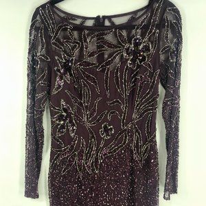Sheer beaded short sheath cocktail dress with long sleeves