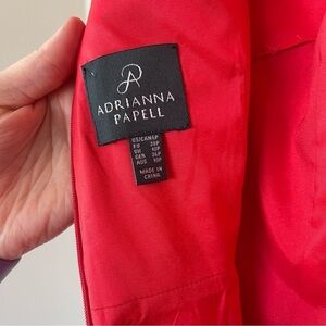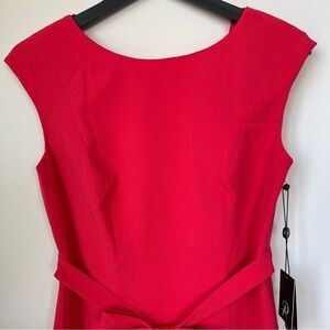 This eye-catching Adrianna Papell dress in vibrant red features a sleeveless design, a flattering sheath silhouette, and a cinched waist with a bow belt. The elegant knee-length cut and structured fabric make it perfect for formal events, weddings, or sophisticated work attire. A timeless piece that exudes confidence and grace.