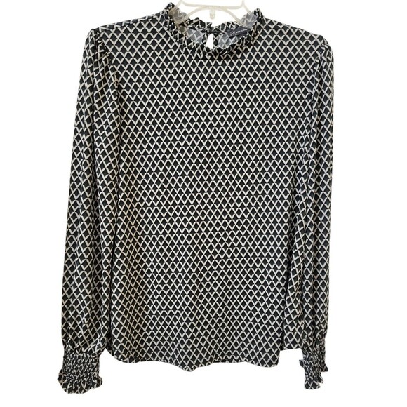 This Adrianna Papell blouse is a stylish and versatile piece in size small. It features a mock neck with a keyhole back and elastic cuffs on the long balloon sleeves. The top is a pullover style with a button accent, made of stretchy polyester and elastodiene material in a geometric pattern of black, green, and gray. Perfect for a party, casual outing, or business setting, this blouse showcases a colorful and classic design suitable for various occasions throughout the seasons. Like new condition!