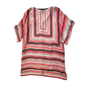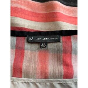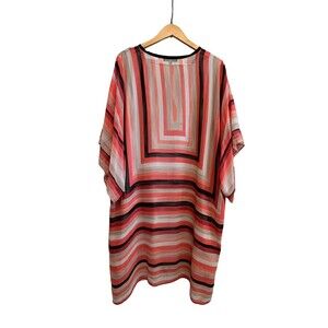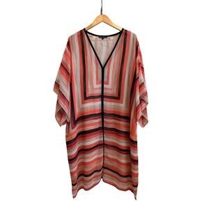 Adrianna Papell lightweight scarf / kaftan dress, featuring a striped pattern in shades of coral, gray, and black. V-neckline trimmed with black and kimono-style, elbow-length dolman sleeves. Lined, polyester, relaxed.