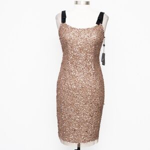 Shimmer in antique copper with this Adrianna Papell beaded cocktail dress, designed to flatter with a fitted silhouette and allover sequin embellishment. Knee Length. The hand-beaded detailing adds texture and light-catching sparkle, while two black grosgrain ribbon ties at the shoulders give it a modern, playful finish. Features a crew neckline, hidden back zipper, and a sheer hem for a touch of elegance. Great for weddings, cocktail parties, or evening events.
