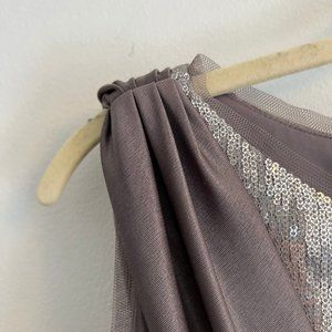 The sequins are a silver color, covered by a darker grey colored mesh. Mesh detailing around the neck and armholes. Rouching around the stomach area, Slit, lined, side zip. Color is hard to describe, to me it seems like a dark platinum grey color with a hint of purple shading.