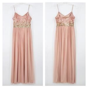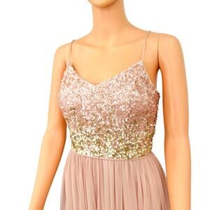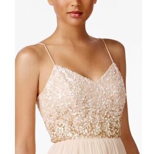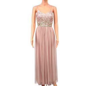 Adrianna Papell Sequined Tulle Gown in Rose Blush Spagetti Strap Maxi Dress Sz 6