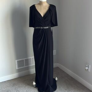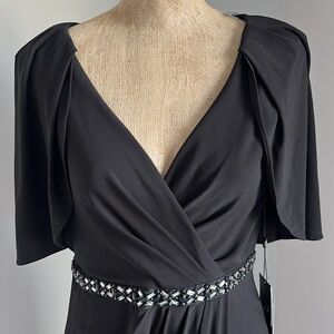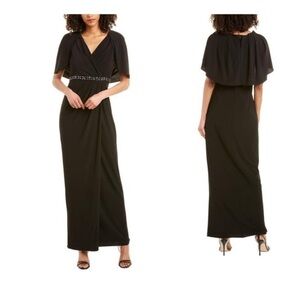 Adrianna Papell V-Neck, Cape Sleeve, Embellished Waist Ruched Front, Zipper Back Jersey Dress, Long Draped