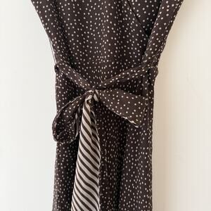 Elegant Adrianna Papell 100% silk wrap dress featuring a chocolate brown base with cream polka dots and contrasting striped trim. Soft pleated flutter sleeves and a self-tie waist create a flattering silhouette. Fully lined in polyester.