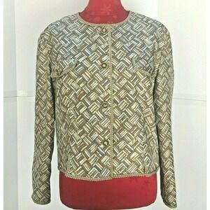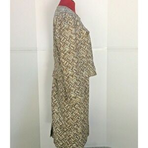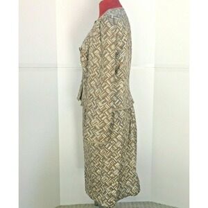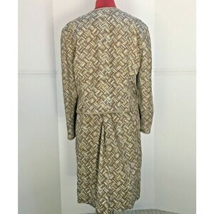 Adrianna Papell 100% silk skirt suit - size 12 - button front blazer & fitted skirt. Tan / buff / cream geometric print. Jacket is trimmed with thick cord ribbon & gold/enamel buttons. A hook is missing on the skirt waistband. Skirt is below knee length with a walking vent & back zipper. Wish I had better pictures because this suit is absolutely gorgeous!