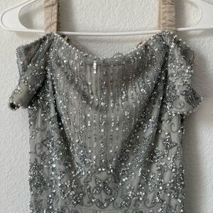 Chic silver dress with sparkling sequins. Designed by Adrianna Papell. Off the shoulder. Only worn once, in perfect condition.