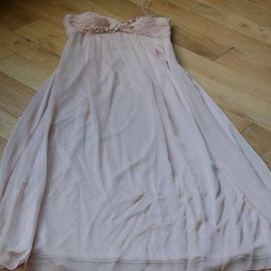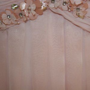 New with tag. Light Pink size 12 long length dress by Adrianna Papell. Empire waist, ruching. Decorative beading, delicate flowers on bustline. Lightly padded cups. Spaghetti strap, fully lined. Side zipper. Shell and Lining 100% Polyester