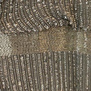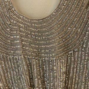 Gorgeous dress! I wore it twice, so now it is time to pass it on to another deserving individual. Purchased from Bloomingdale's or Nordstrom (can't remember which). It reminds me of a Roaring Twenties cut. The top part is blouson style (loose), but there is a waistband at the hip, and below is a slightly more snug fit. Side zipper. Covered in beads and sequins. A few are missing here and there, but it is hard to tell. One partial line of sequins has disappeared, and there is a close-up in the pictures. This dress comes with a bag of sequins and beads too.