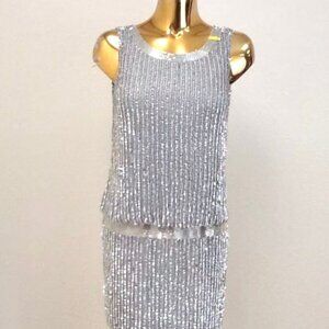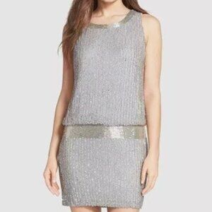 Adrianna Papell Size 4 Formal Silver Sequined & Beaded Blouson Tank Dress