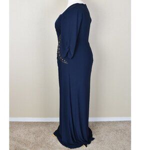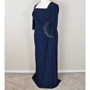 Adrianna Papell Square Neck Bead Embellished Formal Dress. Size 16. Navy blue with navy and dark gray bead/sequin/rhinestone detail. Ruched mid-section. 3/4 sleeves with ruching at cuff. Stretch material. Back zipper. Fully lined.