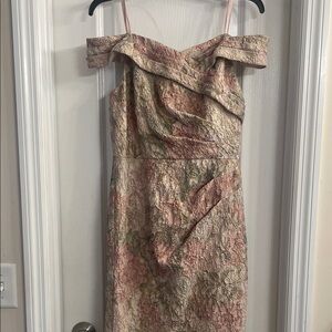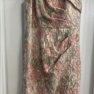 Elegant strapless dress with floral pattern. Features cream with pink and green. Perfect for mother of the bride/groom. Worn once. Fully lined. So comfortable. Very flattering. Has been dry cleaned. Measures 54” long (top - bottom) 16” wide pit to pit.