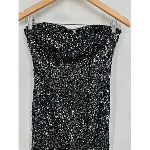 A glamorous strapless black gown adorned with shimmering sequins, featuring a sleek cutout detail and thigh-high slit for a bold, elegant evening look.