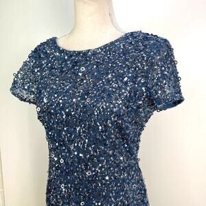 Adrianna Papell Stretch Sequined Zippered Low Back Lined Short Sleeve Boat Neck Knee Length Formal Sheath Dress Nile Blue