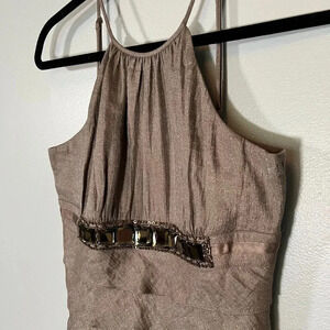 Add a touch of elegance to your wardrobe with this stunning Adrianna Papell Tiered pewter colored dress. This dress features a high neck, adjustable spaghetti straps, and a zip closure. The dress is perfect for a wedding, party/cocktail, or formal occasion. The dress is lightweight and comfortable to wear. It has a beautiful fitted sheath style and has large gemstone/jewel beads and sequin accents under the bust. The fabric has a metallic shimmer and a ribbon tie in the back.