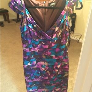 Multi-colored, abstract floral print sheath dress. Adrianna Papell, size 10. Flattering and comfortable. Knee length (I am 5'3").