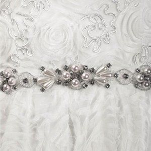 The rosette-covered gown exudes femininity in delicate, embellished tulle. The full-skirt ball gown stuns with a beaded empire waist and tulle rosettes throughout for the ultimate princess-chic look. Strapless. Approx. length from top center front to hem: 56". Fully lined, with rubber grippers, boning and padded cups in bodice and tulle crinoline in skirt.