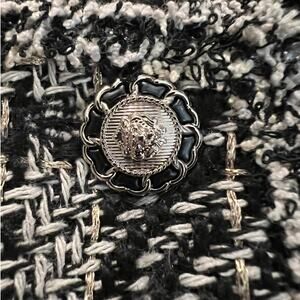 Elevate your wardrobe with this stunning Adrianna Papell tweed jacket! This size large jacket features a classic black and white tweed pattern, beautifully accented with subtle gold strands for a touch of sparkle. Button are silver w/black beads and jacket has shoulder pads.