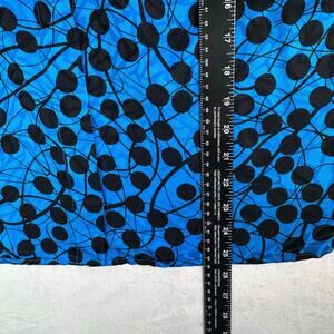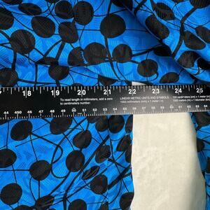 Beautiful vibrant blue and black abstract polka dot print. 100% silk with a smooth, lightweight feel. Long sleeves with button cuffs, hidden button placket, and gathered details at shoulders.