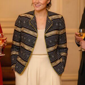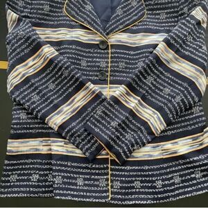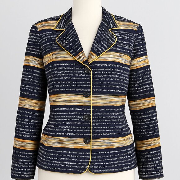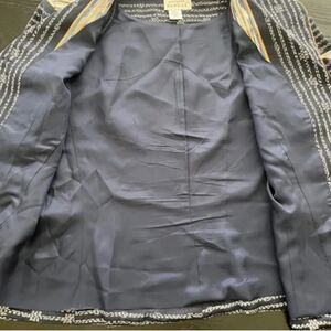 Adrianna Papell Vintage Silk Blazer Jacket Navy White Abstract Print. Size Medium. Notched collar with gold contrast piping. Button-front closure. Lightweight silk with full lining. Statement vintage pattern. 100% silk outer, 100% acetate lining. Approx. measurements: pit to pit 20", Shoulder to bottom hem 23", bust across front 18" (36" around), shoulders across back 17", sleeves pit to bottom 15", sleeves shoulder to bottom 22". Light padding in shoulders. Color is vey dark, deep navy blue (appears almost black).