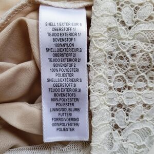 This white lace dress from Adrianna Papell features a gorgeous illusion eyelash lace overlay in bright white with a tan underlayer, a sleeveless semi fitted sheath / shift silhouette, and a rounded neckline. It has bra stays / lingerie straps at the inside shoulders, a full lining and concealed back zipper. Nylon / Polyester