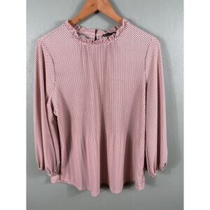 Adrianna Papell Women Large Pink Polka Dot Ruffle Hem Long Sleeve Top Blouse