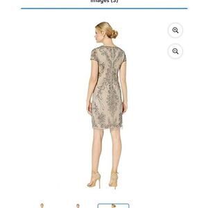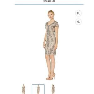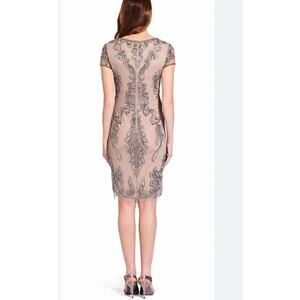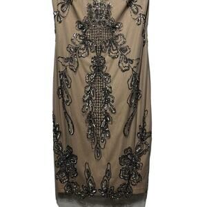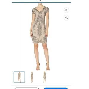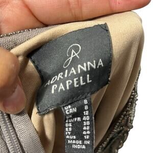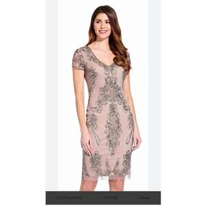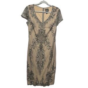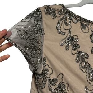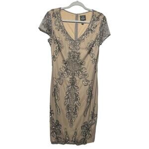 Adrianna Papell Women’s Beaded Mesh Cocktail Dress / Size-8 / Color- Nude With Silver Gold Beading / Pre-Owned / V-Neckline And Sheer, Short Sleeve, concealed Back Zipper Closure, Raw-Edge Detail At Straight Hemline / Gorgeous Beading On Sheer-Poly Fabrication