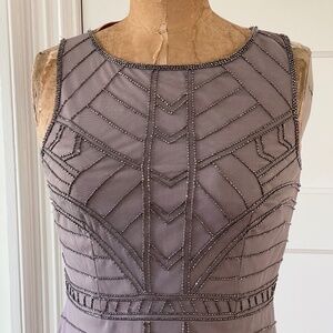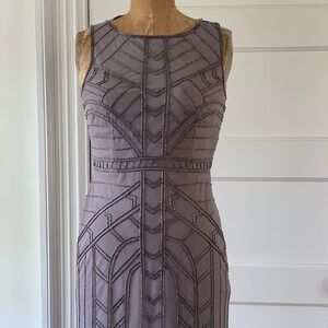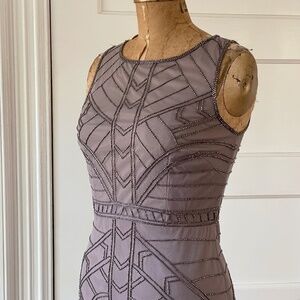 Adrianna Papell Studio bodycon sleeveless beaded sheath dress adorned with sparkling handsewn beadwork in an Art Deco-style pattern