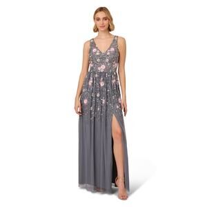 Adrianna Papell Women's Dusty Blue Multi Beaded Mesh Long Dress Size 5 NWT. Cheery sequin flowers bring this evening gown to life. This formal dress features a sleeveless bodice with sheer tank straps, a v-neckline, illusion back, and a soft skirt with thigh-high slit. Designed with mesh knit fabric that is lined through the body and embellished in a mix of sequinand bead 3D florals, this gown is pure romance. Step into nude heels and grab a clutch that matches the beading for a look that is sparkling as it is sweet.
