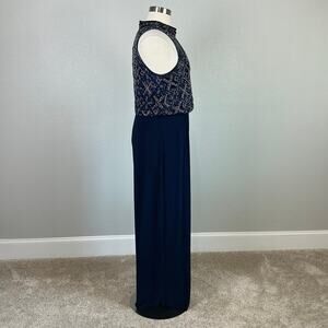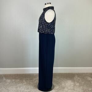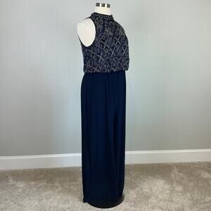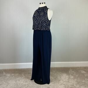 Adrianna Papell Women's Jumpsuit Size 18 Blue Beaded Wide-Leg Sleeveless Halter
