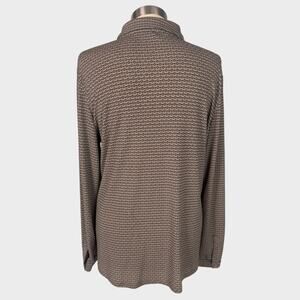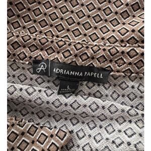 This Adrianna Papell blouse is in excellent condition, showing no signs of stains, tears, or flaws! It features a stylish button-front design with a unique gray and brown print, perfect for adding a touch of sophistication to any outfit.