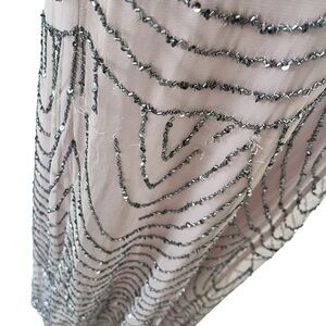 A scalloped, art deco pattern filled with sparkling sequins and beading adorns this evening gown, which also features a back-zipper closure