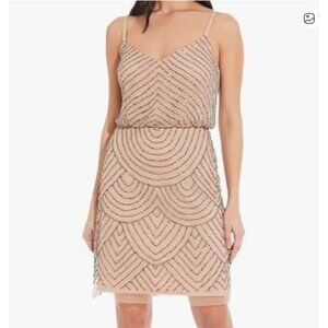 Adrianna Papell Women's Sequined Beaded Blouson Dress Taupe/Pink Strappy Sz 2