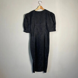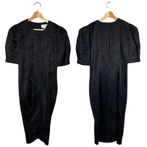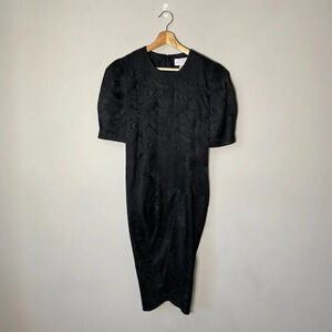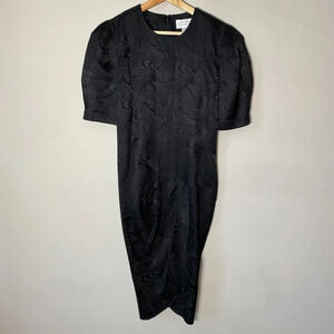 This beautiful black sheath dress from Adrianna Papell is a must-have for any wardrobe. Made from 100% silk with a satin fabric type, this knee-length dress features a wavy pattern, short cap sleeves, and a round neckline. It has a slimming effect and is perfect for travel, weddings, holy communions, parties, cocktails, casual outings, workwear, and business meetings. The dress is collarless, lightweight, and has a zip closure. The vintage style of this dress makes it a classic addition to any outfit. It is suitable for all seasons, including winter, summer, fall, and spring. The dress is a size 6 and is regular in size type. It is perfect for a designer, wedding, baby shower, city, classic, 90s, retro, and preppy theme. This dress is not handmade and was manufactured in Hong Kong.