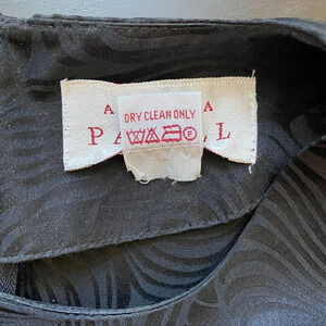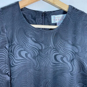 This beautiful black sheath dress from Adrianna Papell is a must-have for any wardrobe. Made from 100% silk with a satin fabric type, this knee-length dress features a wavy pattern, short cap sleeves, and a round neckline. It has a slimming effect and is perfect for travel, weddings, holy communions, parties, cocktails, casual outings, workwear, and business meetings. The dress is collarless, lightweight, and has a zip closure. The vintage style of this dress makes it a classic addition to any outfit. It is suitable for all seasons, including winter, summer, fall, and spring. The dress is a size 6 and is regular in size type. It is perfect for a designer, wedding, baby shower, city, classic, 90s, retro, and preppy theme. This dress is not handmade and was manufactured in Hong Kong.