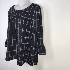 Adrianna Papell Womens Top Medium Black White Plaid Bell Sleeve Keyhole Relaxed
