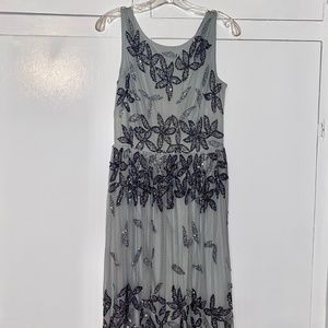 Beautiful light blue-gray Adrianna Papell midcalf length beaded gown with sequin accents. Style is "Give it Everything You've Haute". Sleeveless, scoop neck in front. V-back, zipper down to waistline. Polyester exterior and lining. Feels like silk. Size 6, like new, worn once for a wedding.