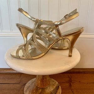Really cute grecian style gold leather and braid sandals. Very good condition with 1 small scuff (see pic) 3" heel. Size 6 runs wide.
