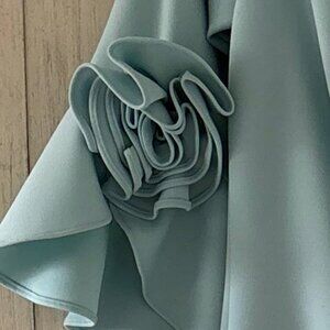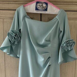 A romantic, timeless gown perfect for formal events like weddings, galas, or as mother-of-the-bride attire. The combination of 3/4 flutter sleeves embellished with a fabric rosette. The dress is polished elegance, and the pastel green hue flatters many skin tones.