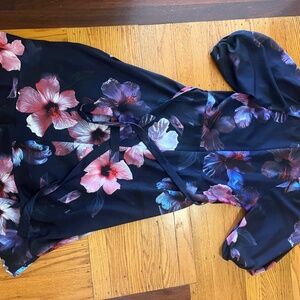 Very cute and flattering dress! Short sleeved, dark purple with hibiscus flowers