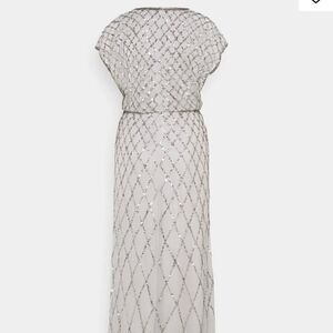 Adrianna Papell sequin lattice dress with flutter sleeves in Bridal Silver- NWT Shine bright all night when you attend your next formal event in this stunning special occasion dress. This gorgeous evening dress features a flattering v-neckline with beaded trim, short flutter sleeves, and a beaded blouson bodice. A long, flowing skirt with a sequin lattice pattern and back zipper closure round out the features on this show-stopping formal dress. Add in a pair of sparkling statement earrings and eye-catching metallic accessories to forge a look that's designed to dazzle.